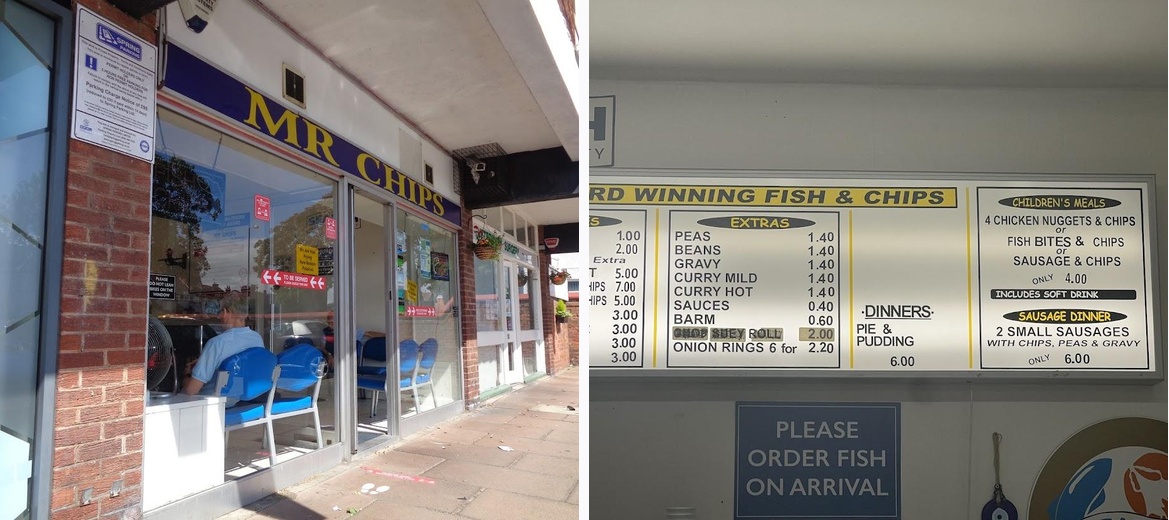 Went to Mr Chips tonight for the first time as did not want to go to our normal chippy in town as the flower show is on. How glad I am. Had 2 well done cod which were lovely and crispy when I got them home, alongside a carton of mushy peas. I will be using Mr Chips in future for our Friday night chippy tea. Highly recommended. A last note is that they only take cash.